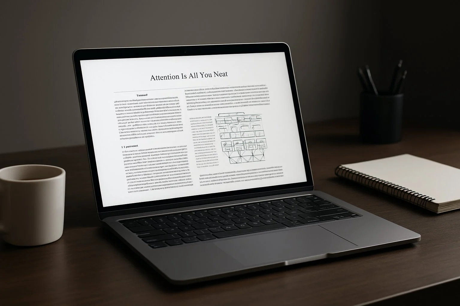 Vista realista de un entorno de trabajo técnico con un paper sobre Transformers abierto en laptop. Parte del resumen de Attention is All You Need.